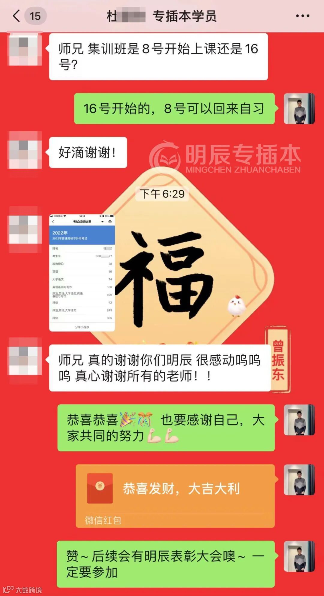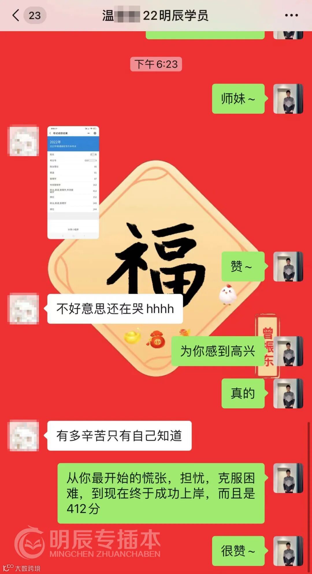 所以还没有查成绩的学员们,记得找老师报喜讯领红包哦~当然也不要忘了后续还有填报志愿的环节,明辰会有老师提供专业指导。