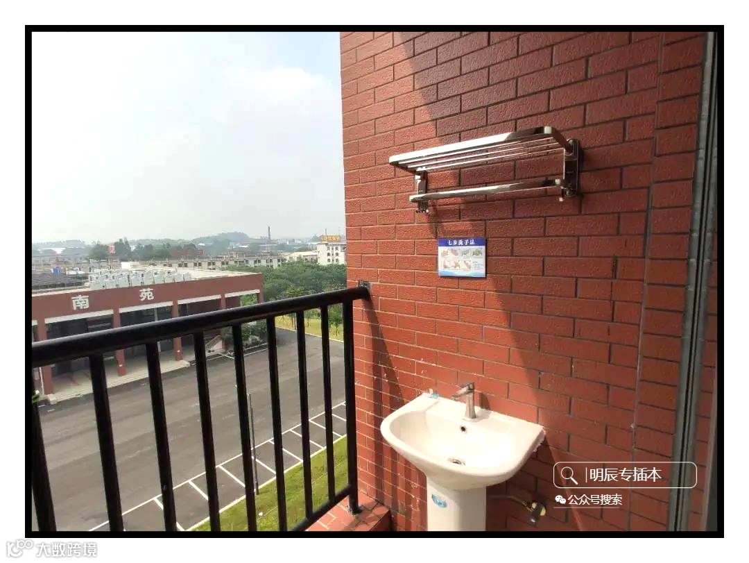 开放式阳台有插座、水龙头以及排水口、洗脸台、晾衣杆等必要设施。
