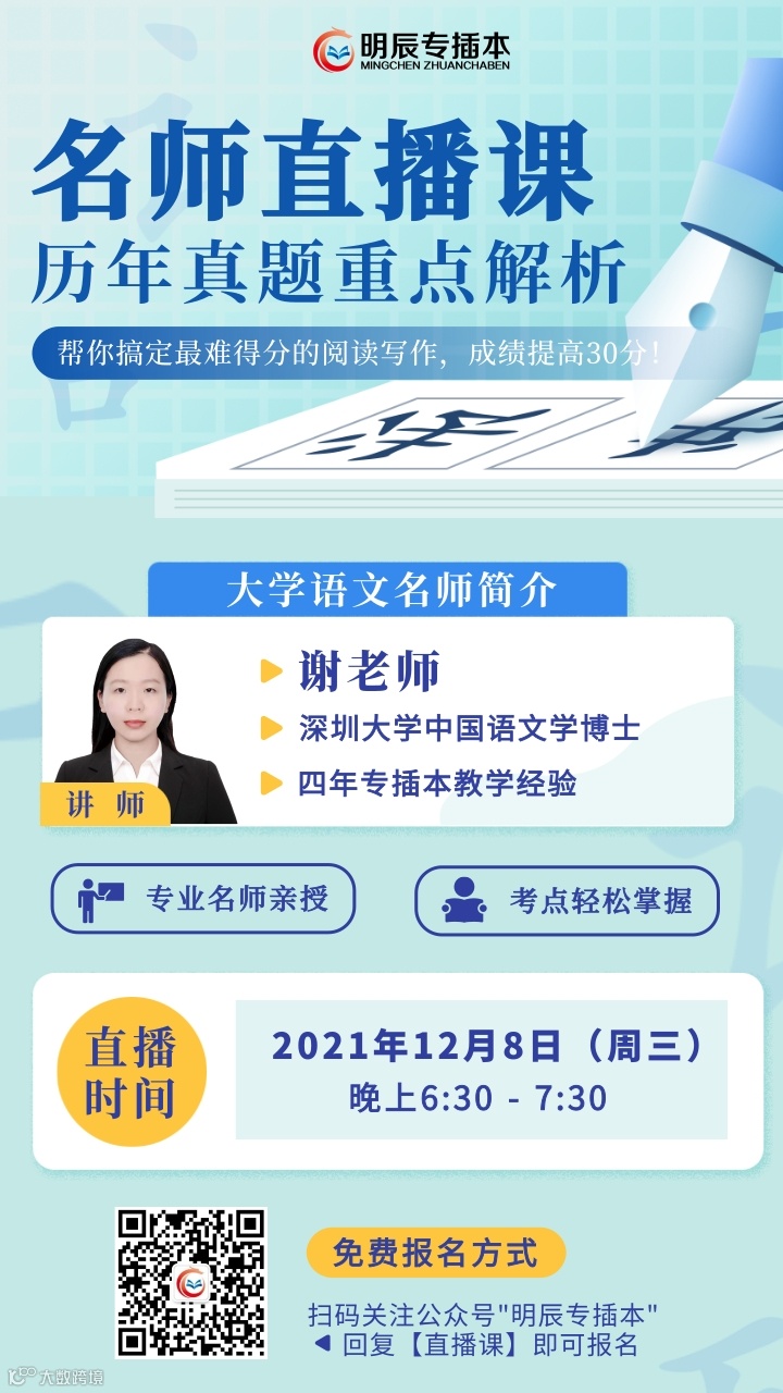 本周三晚上6:30-7:30,明辰专插本的大学语文谢老师将为大家讲解专插本大学语文历年真题--阅读写作的重点解析,各位同学记得准时来听课哦!