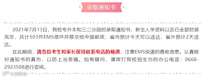 邮件以及普通专升本《新生指南》等材料需时间整理,《录取通知书》预计在7月中下旬用过EMS寄出,请耐心等待。注册以及开学时间以收到的录取通知书信息为准。