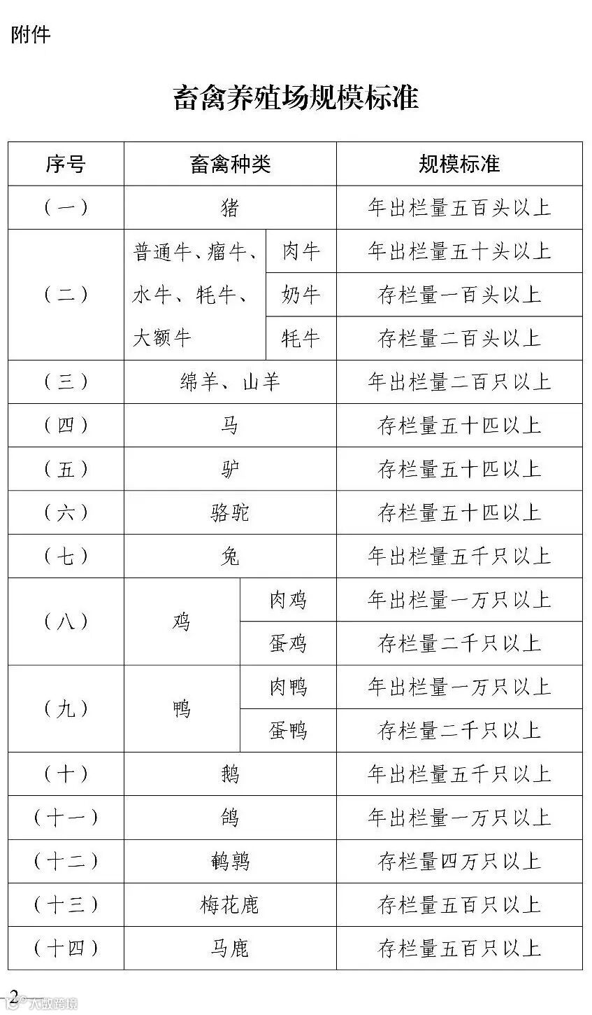 根据《中华人民共和国畜牧法》和《畜禽养殖场备案管理办法》规定,结合我国畜禽养殖发展实际,我部组织制定了畜禽养殖场规模标准,现予公布,自2025年9月1日起施行。