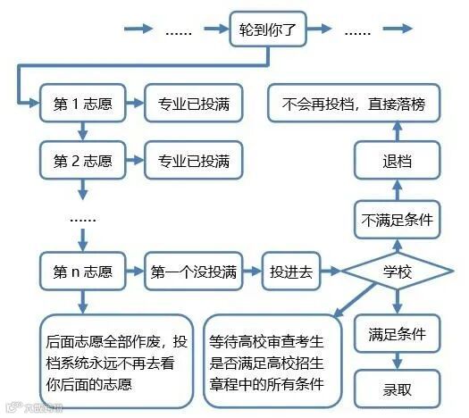 遵循志愿是指考生所填报的多个院校志愿有自然顺序,检索院校志愿时,按考生填报志愿时排列的院校自然顺序依次进行。当考生的投档分符合先检索院校志愿投档条件时,则不再检索该考生的后续院校志愿。