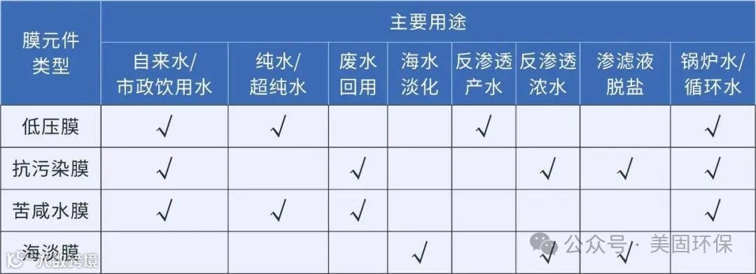 目前市场上常见的反渗透膜元件的类型有:低压膜、抗污染膜、苦咸水膜、海水淡化膜等,不同膜厂家也都有多种性能不同的反渗透膜。