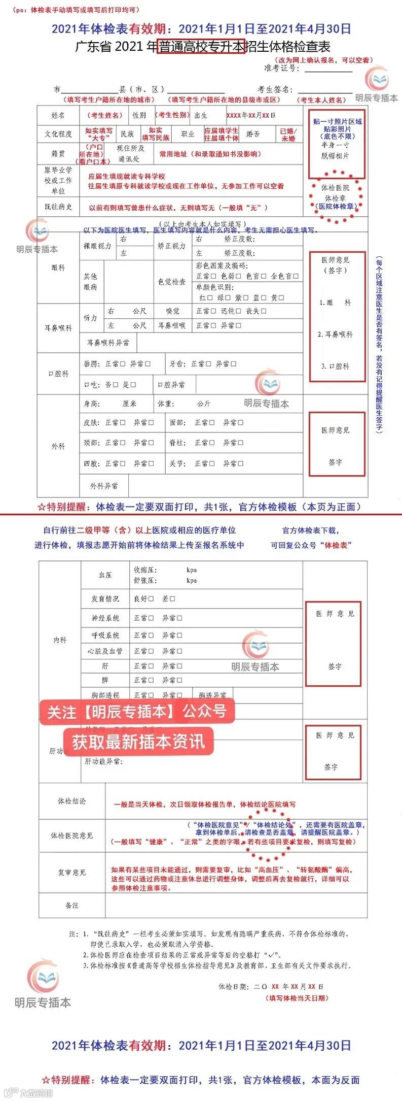 在去医院体检之前,体检表内的考生信息需要提前填写完整,准备好一张一寸的相片(底色无要求),或者去医院之前把相片贴在体检表上。