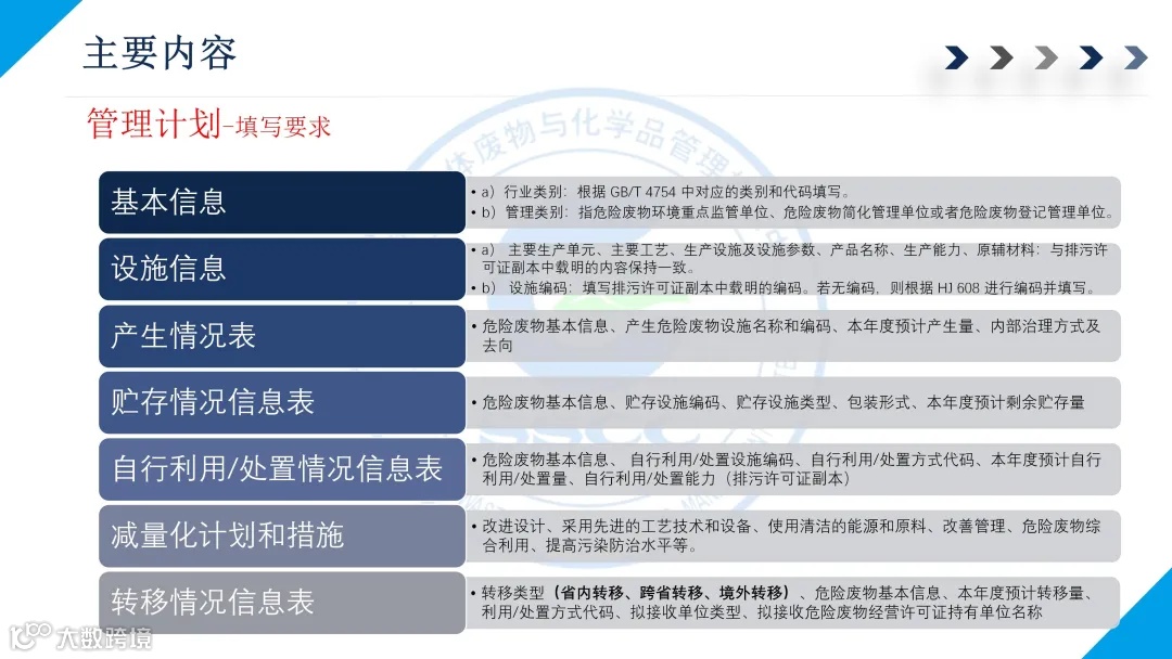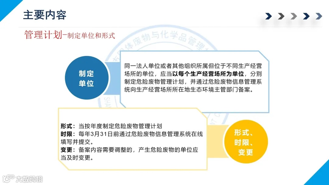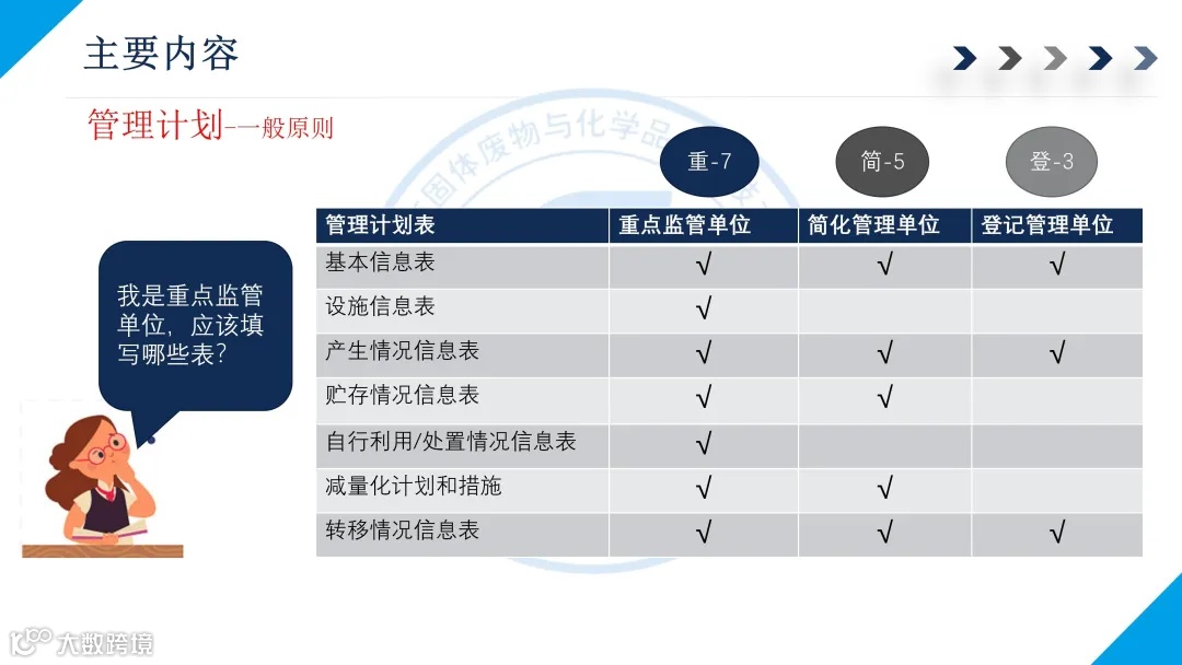 一是危险废物管理计划制定内容。对于危险废物环境重点监管单位,管理计划制定内容包括单位基本信息、设施信息、危险废物产生情况信息、危险废物贮存情况信息、危险废物自行利用处置情况信息、危险废物减量化计划和措施、危险废物转移情况信息;对于简化管理单位和登记管理单位,管理计划制定内容相应减少。