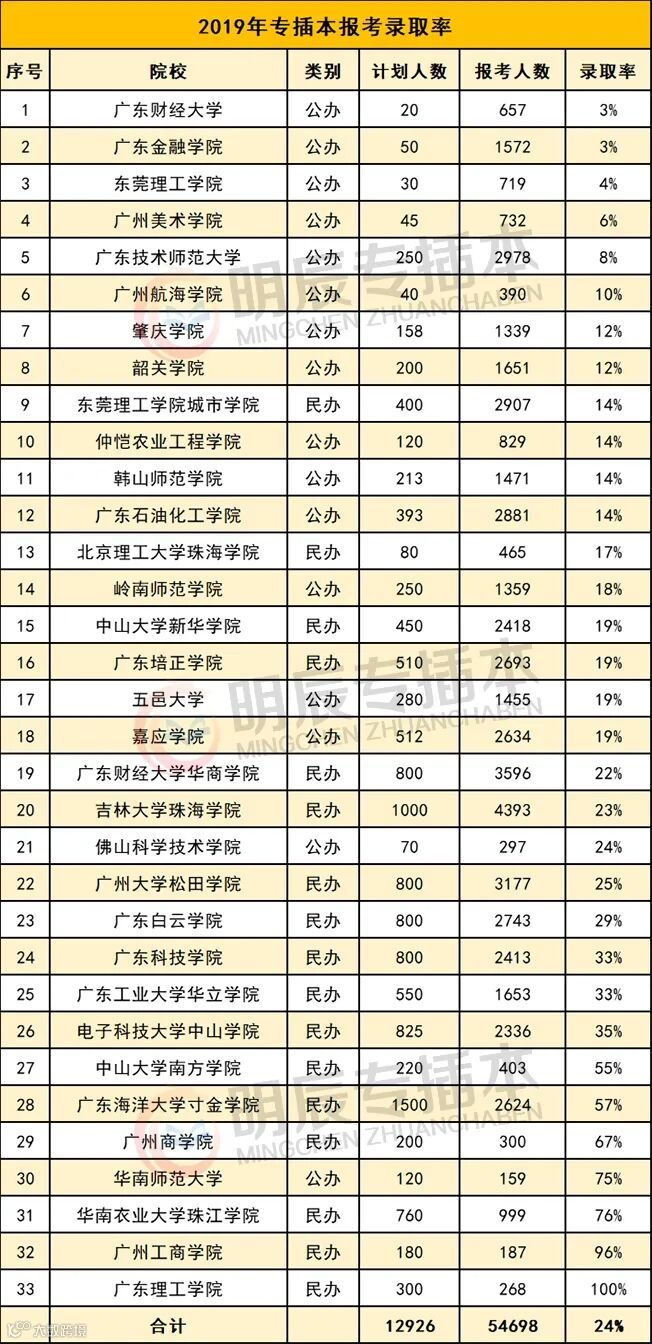 2019年广东专插本计划招生总人数为12926人,预报名超过了6万人,而确认报考人数只有54698人,只有24%的考生能够成功上岸。