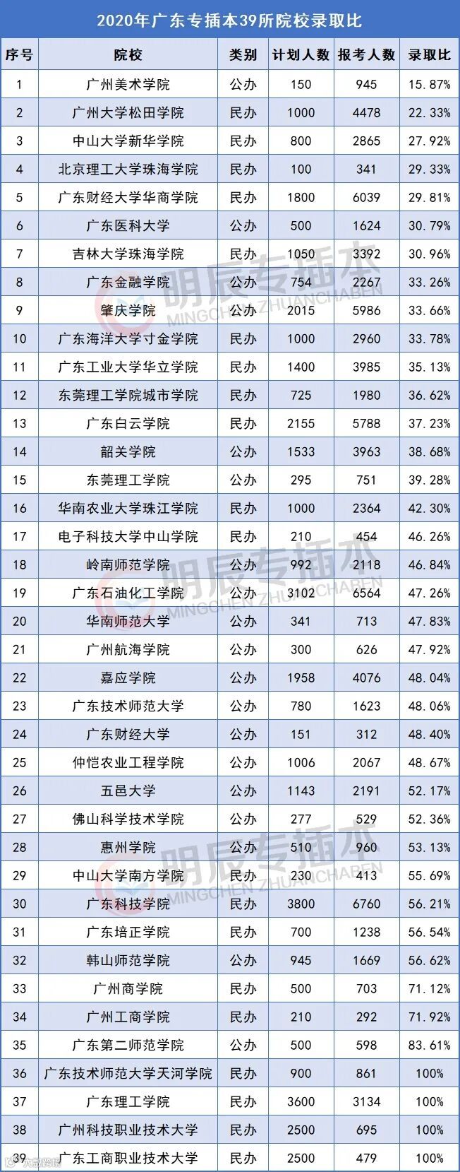 根据广东省教育考试院公布的数据,2020年广东省本科插班生总报考人数为88803人,招生计划人数43432人,高达49%的录取率!
