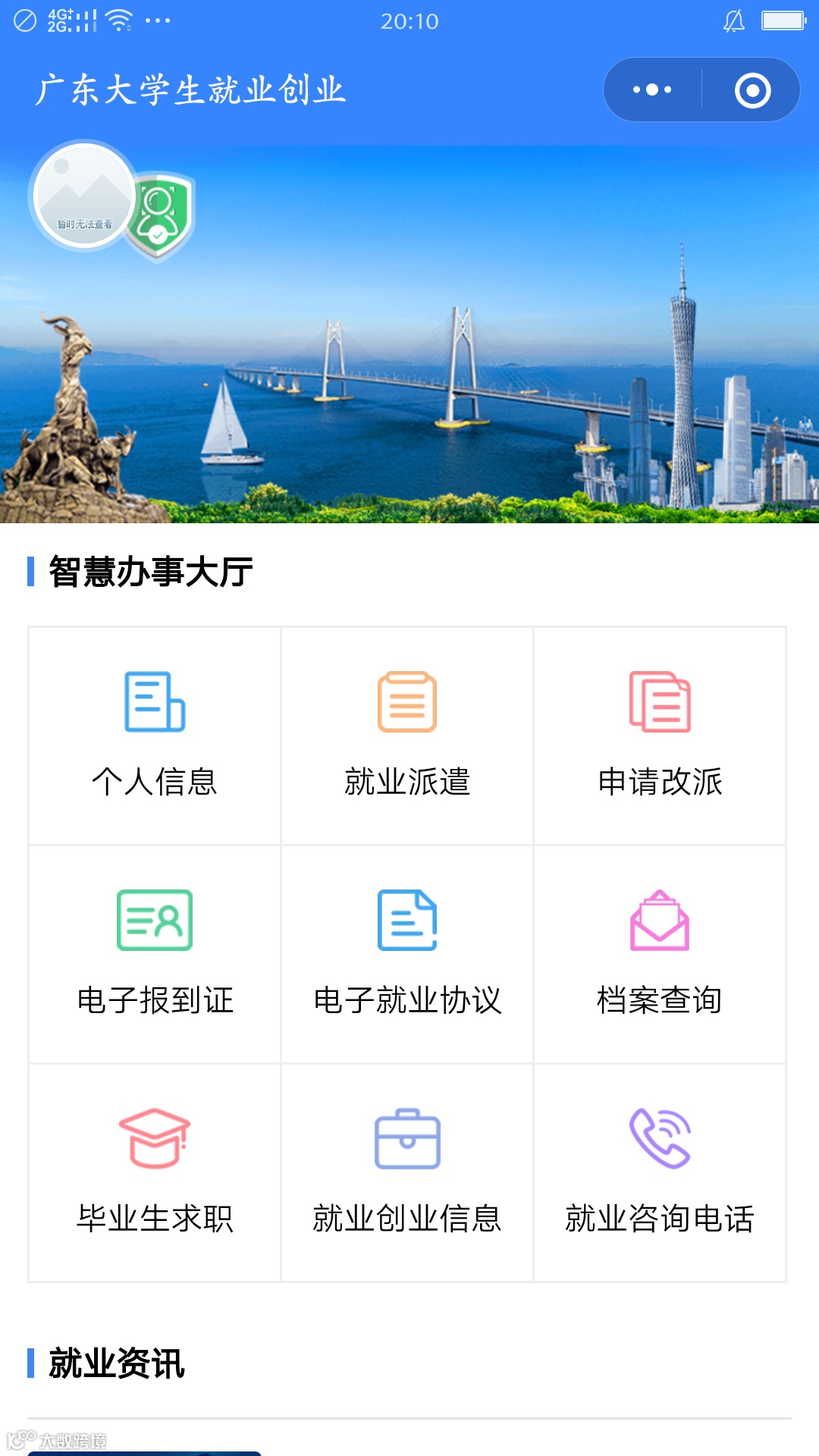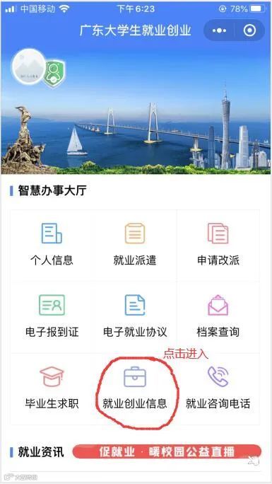 一、登陆“广东大学生就业创业”小程序,进入智慧办事大厅如下图。