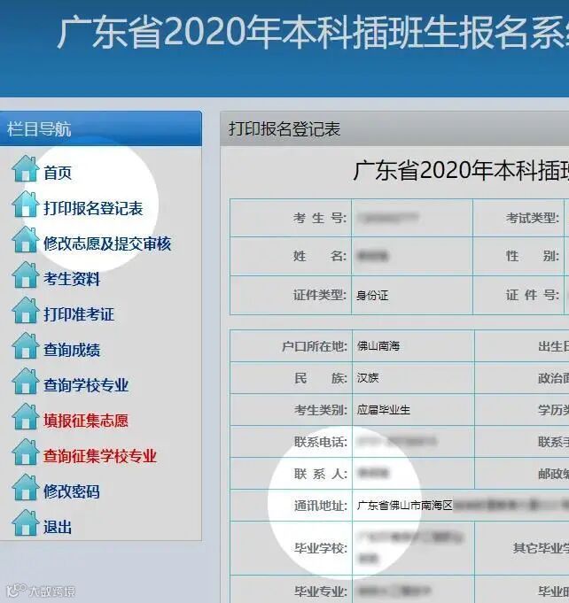 登录报名系统后,点击“打印报名登记表”,便能看到通讯地址和电话: