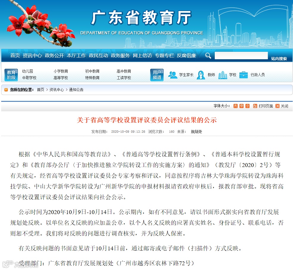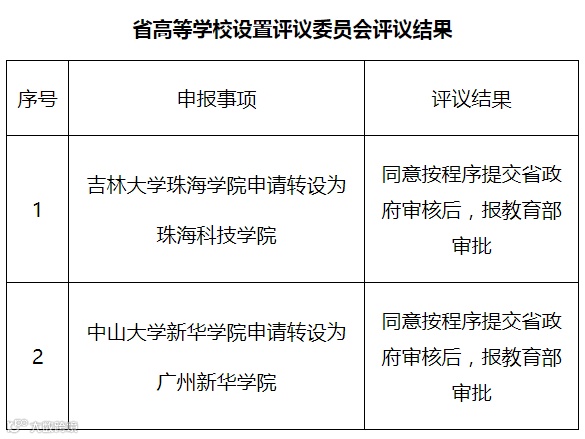 今天,广东省教育厅公布《关于省高等学校设置评议委员会评议结果的公示》,经省高等学校设置评议委员会专家考察和评议,同意按程序将吉林大学珠海学院转设为珠海科技学院、中山大学新华学院转设为广州新华学院的申报材料报请省政府审核后,报教育部审批。