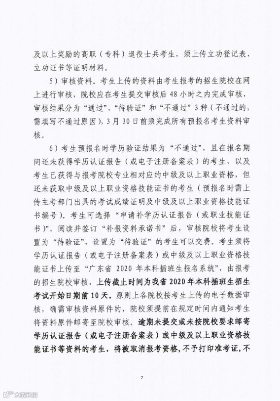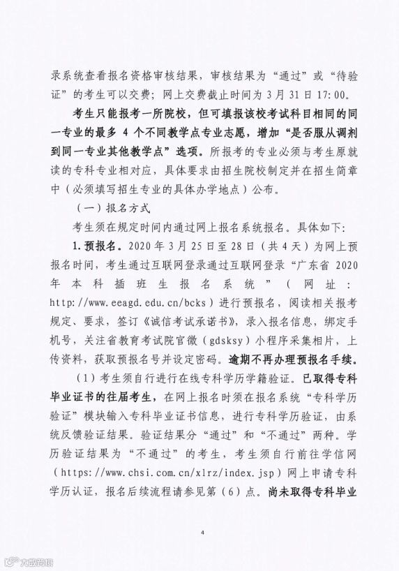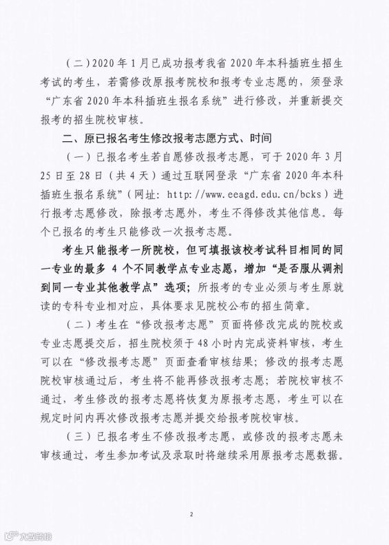 二、修改志愿:每个已报名的考生可修改一次志愿,于25日-28日(共4天)在广东省2020年本科插班生报名系统中修改,并且增加“是否服从调剂到同一专业其他教学点”选项。(比如护理学有4个教学点,你报名了广州教学点的护理学专业,如果选择服从调剂教学点,考上了很有可能分配去别的地方的教学点护理学。)