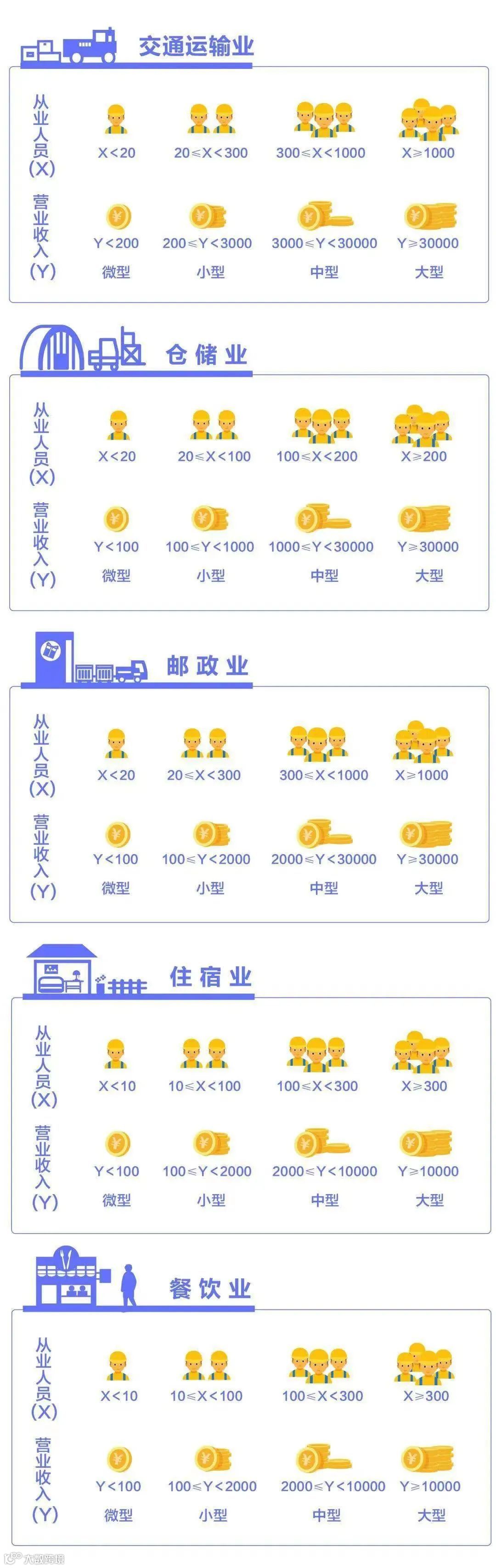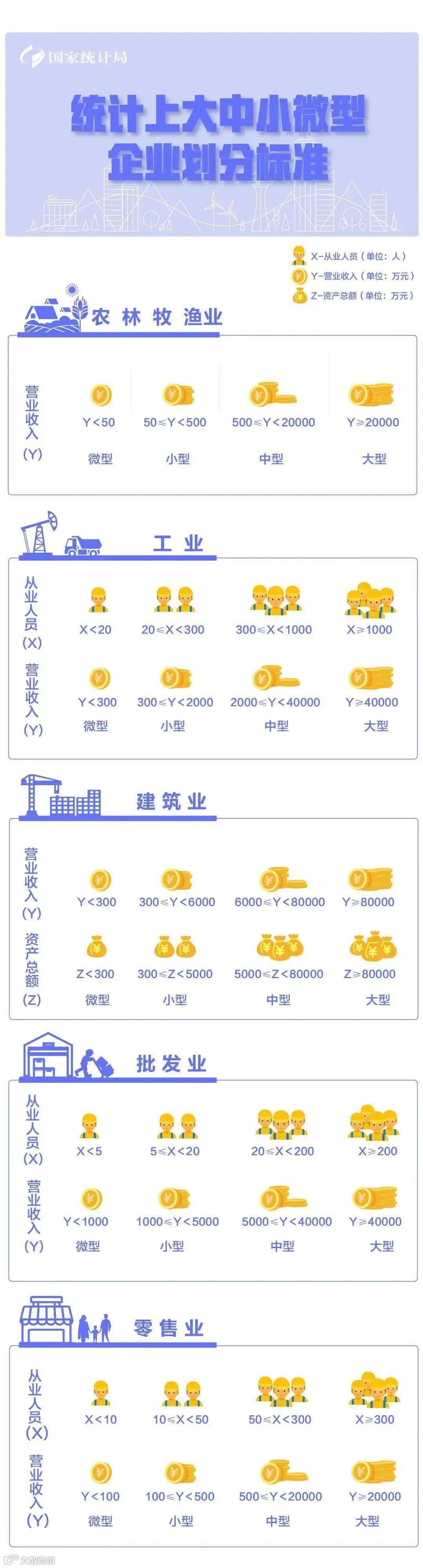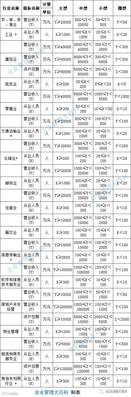 3.企业划分指标以现行统计制度为准。(1)从业人员,是指期末从业人员数,没有期末从业人员数的,采用全年平均人员数代替。(2)营业收入,工业、建筑业、限额以上批发和零售业、限额以上住宿和餐饮业以及其他设置主营业务收入指标的行业,采用主营业务收入;限额以下批发与零售业企业采用商品销售额代替;限额以下住宿与餐饮业企业采用营业额代替;农、林、牧、渔业企业采用营业总收入代替;其他未设置主营业务收入的行业,采用营业收入指标。(3)资产总额,采用资产总计代替。