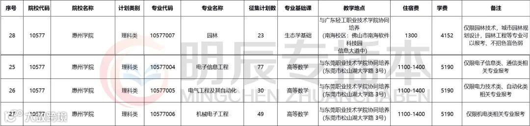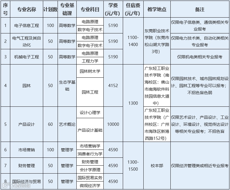 其中有5个是“协同培养”专业,与东莞职业技术学院、广东轻工职业技术学院进行联合办学。专业均有限制。