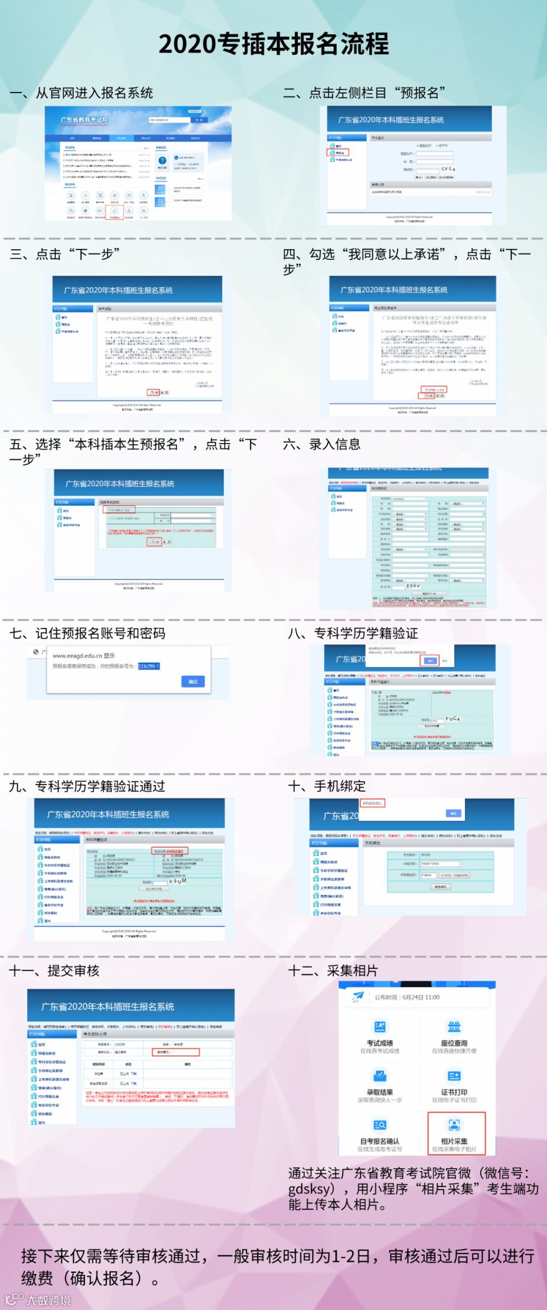 报名流程:①填写预报名信息 >> ②学历学籍验证、绑定手机、采集相片、上传资料 >> ③提交审核 >> ④院校审核 >> ⑤网上缴费并确认报名 >> ⑥报名完成