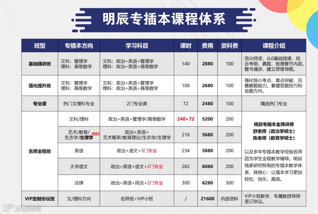 明辰课程分为名师全程班(最划算、福利最多、包含专业课)、基础精讲班、强化提升班、专业课以及VIP小课班,同学们可以根据自身情况选择哦!