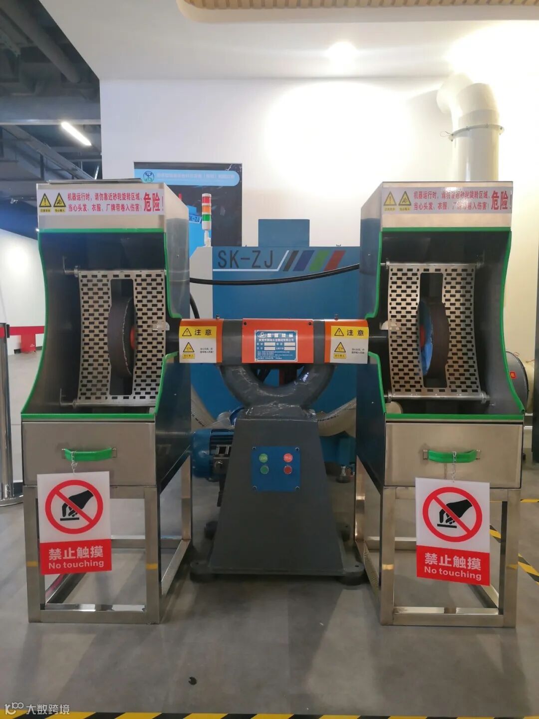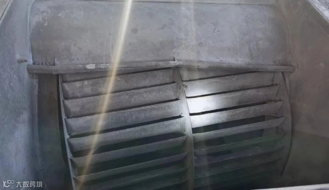 如图示,在生产车间到抽风机端属于负压抽尘的方式,但在大量积尘的抽风机空间和水池部分使用正压除尘的方式进行吹尘,属重大生产事故隐患。
