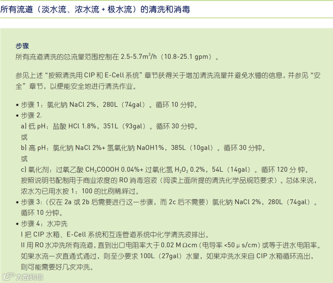 此种污染情况下,需要按照原厂电子手册上的EDI清洗流程进行化学清洗。由于污染可能发生在不止一种水室,可以直接进行所有流道的化学清洗。
