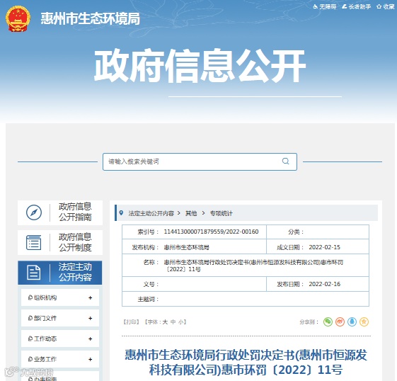 来源:惠州市生态环境局惠东分局政府信息公开网