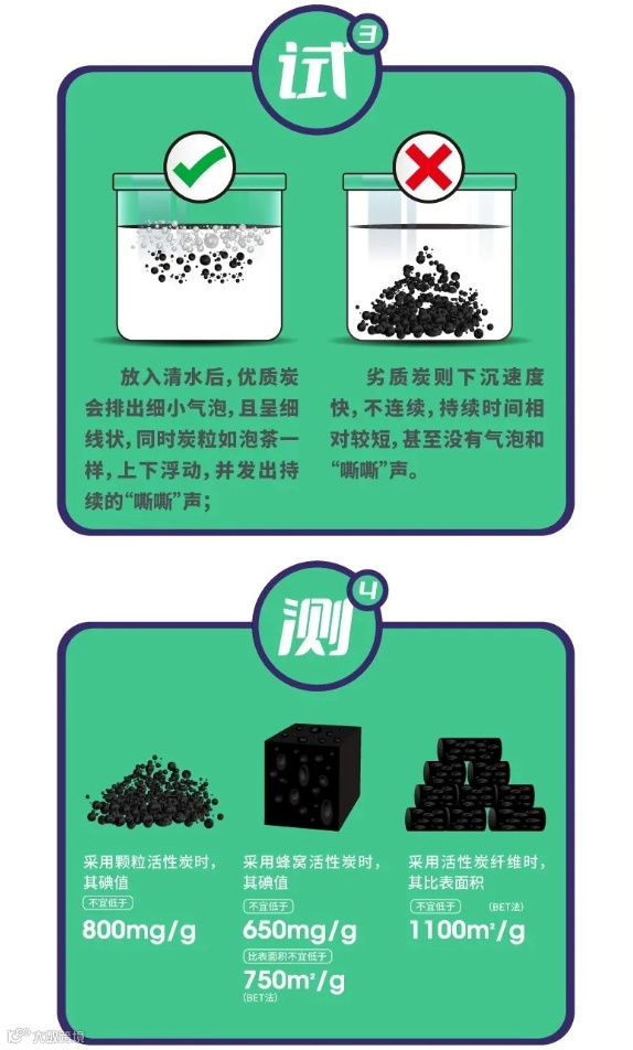 选择符合相关产品质量标准的活性炭。活性炭、活性炭纤维产品销售时应提供产品质量证明材料。