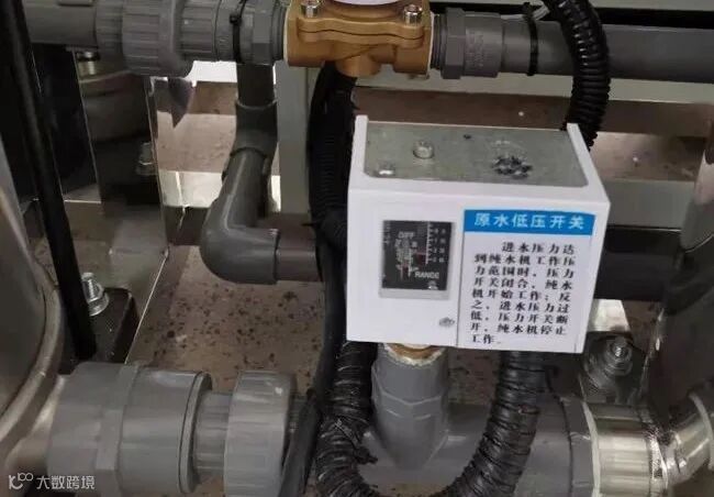 压力开关的功能是按系统工艺要求而设置的水压控制主机运行或停止的保护装置,当原水供水压力低于系统设定值时,压力开关会自动将主机关闭,以避免高压泵在缺水的时候或无水时空转,造成泵的损坏,它的最低值大致设备置在20---50PSI之间。