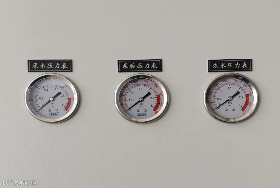 膜前压力表显示水进入膜时的水压情况,浓水压力表显示最后一根膜出口到浓水调节阀之间的压力。这两块表配合观察,可以知道压差情况,这一点在实际运行中是很重要的。调整运行参数时,应以膜前压力表为依据调整系统压力,尤其是当系统压力在上限时,且膜压差又较大时,更应该注意这一点。
