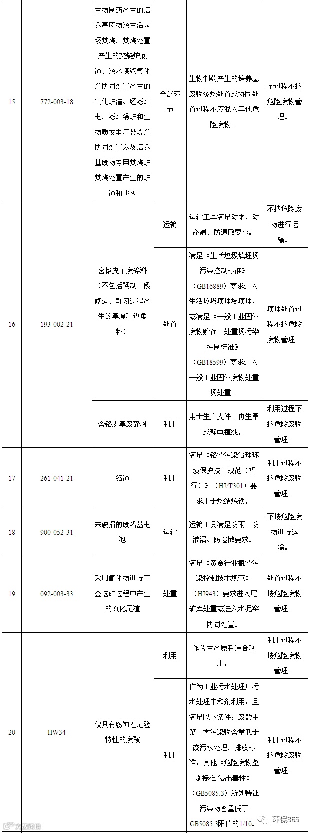 如:生活垃圾焚烧飞灰满足《生活垃圾填埋场污染控制标准》(GB16889-2008)中6.3条要求且进入生活垃圾填埋场填埋,填埋过程可不按危险废物管理;如果不能满足《生活垃圾填埋场污染控制标准》(GB16889-2008)中6.3条要求或不进入生活垃圾填埋场,则处置过程仍然需要按照危险废物管理。
