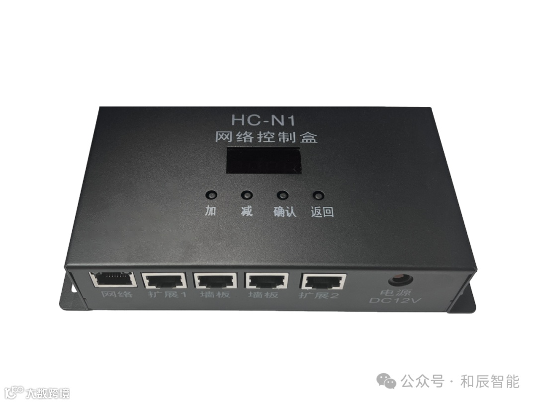 有一路网络接口,可以连接网络服务器或者前台电脑,给控制发送指令,控制房间的灯光,空调,时序器等设备