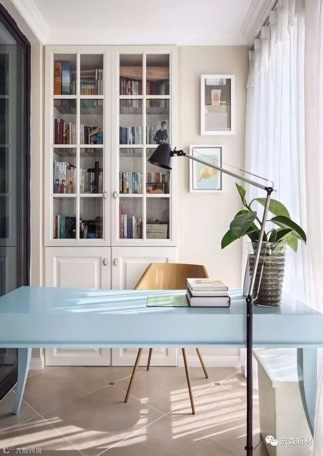 把阳台设计成书房,安装一个书柜,最好选择玻璃门类的柜子,便于日常查找书籍,因为阳台的属性,阳台的柜子最好要注意防晒、防潮。