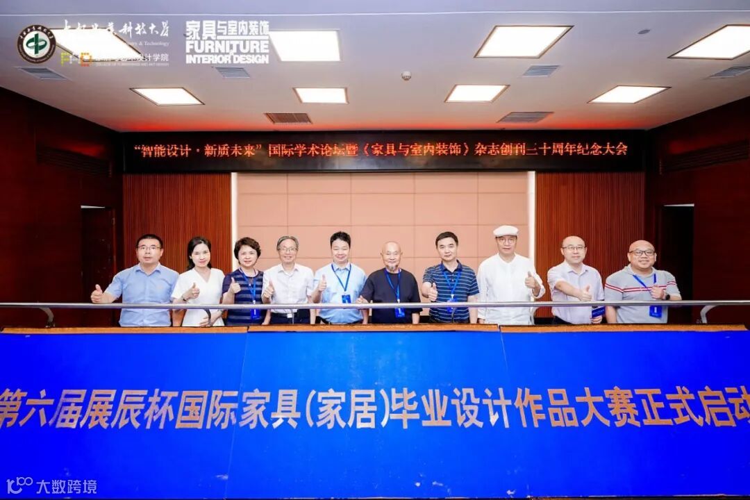 启动仪式嘉宾从左至右依次为:展辰新材市场营销中心总经理杨求贵先生,工业和信息化部工业设计赋能中小企业联盟副秘书长欧爽研究员,沈阳建筑大学设计艺术学院院长冼宁教授,清华大学美术学院可持续设计研究所所长周浩明教授,南京林业大学家居与工业设计学院党委书记朱剑刚教授,中南林业科技大学家具设计与制造专业创始人、《家具与室内装饰》杂志创始人胡景初教授,中南林业科技大学家居与艺术设计学院院长、《家具与室内装饰》杂志总编辑戴向东教授,澳门城市大学创新设计学博士生导师、顺德学院设计学院前院长彭亮教授,中南林业科技大学家居与艺术设计学院副院长、《家具与室内装饰》杂志执行总编辑黄艳丽教授,湖南省设计艺术家协会副主席安勇教授。