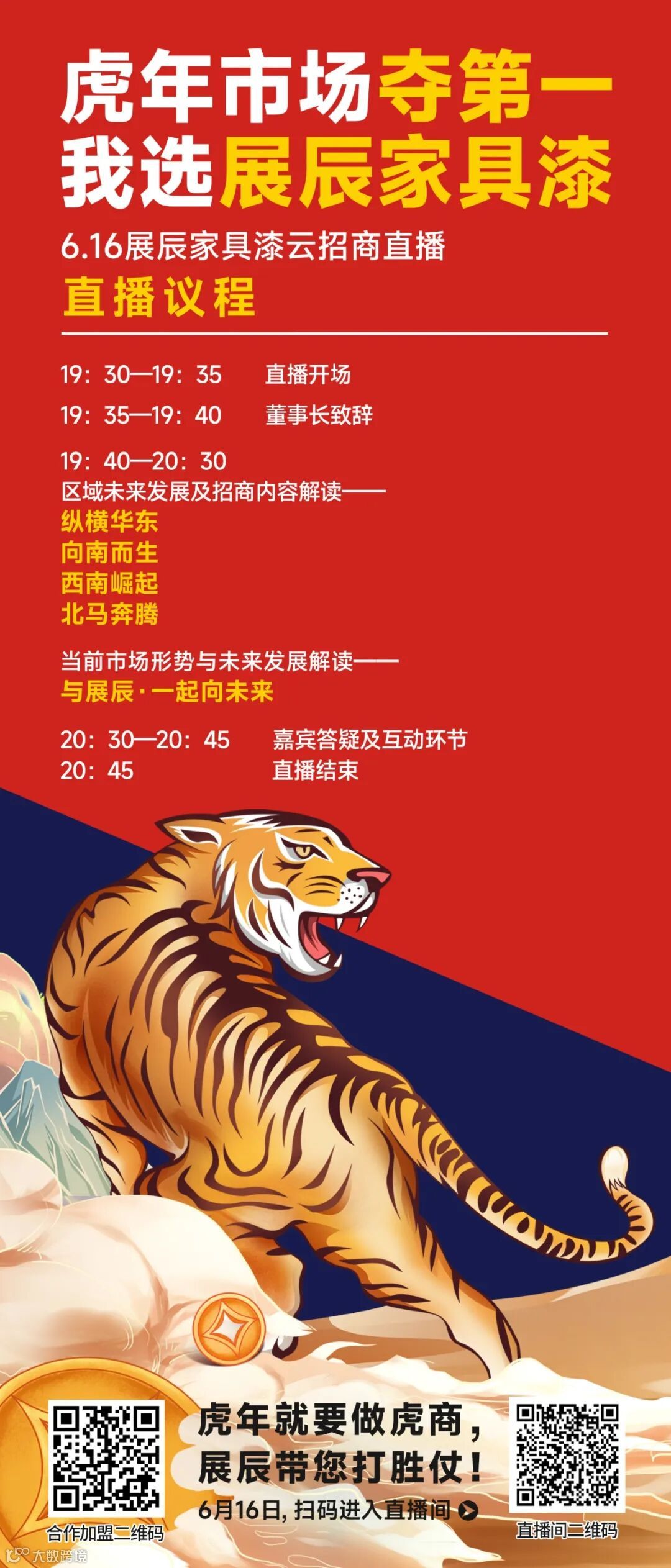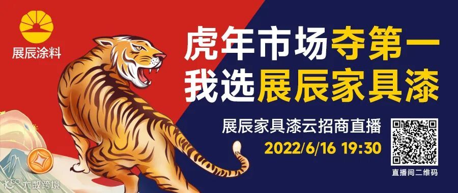 2022年6月16日展辰家具漆将举办第二场虎年的云招商直播,展辰各大公司总经理轮番上场,解读国内外各大区域未来发展和招商策略。董事长陈冰先生、家具漆营销总监杨求贵先生还将从集团发展的角度,剖析市场形势和明晰未来家具漆发展的整体思路和战略。