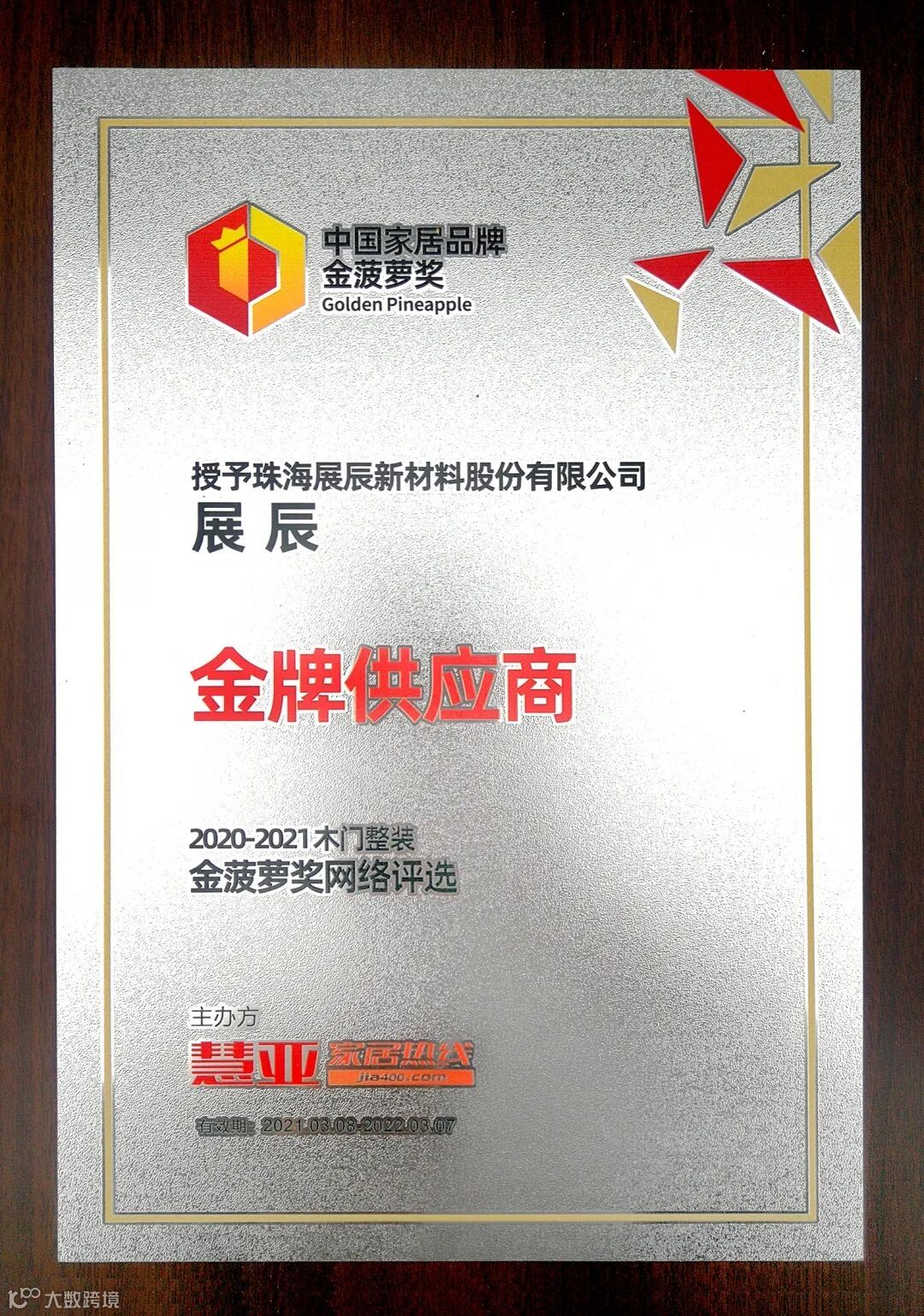 2020年以来,疫情虽然给各行业带来了影响,但展辰新材砥砺前行、无惧困难,与木门行业共同努力,为客户提供高效优质的产品和服务,在本次评选中,再次荣获“金牌供应商 ”称号!