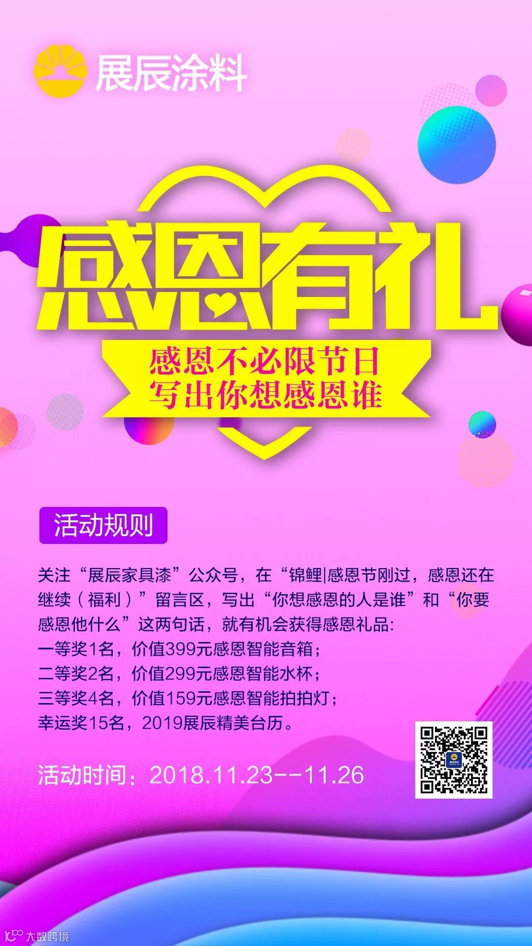 2018年11月23日—11月26日,在“锦鲤|感恩节刚过,感恩还在继续(福利)”的留言区,写出“你想感恩的人是谁”和“你要感恩他什么”,前100名就有机会获得展辰的感恩礼品。