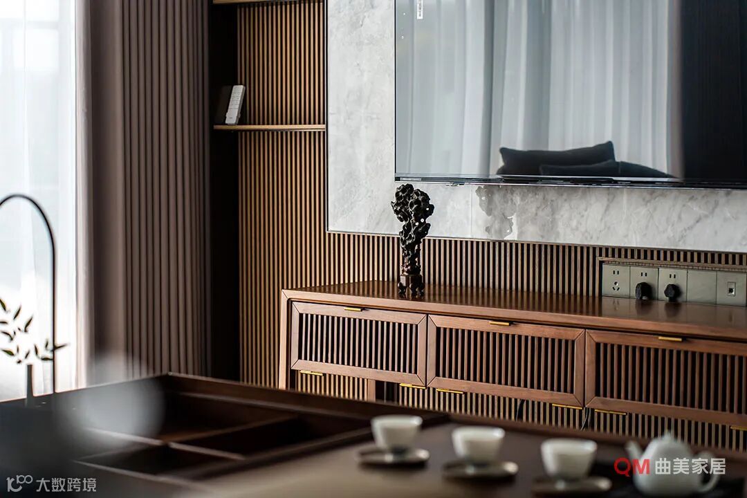 茶几延续了同系列的设计语言,低矮的方形轮廓与电视柜形成视觉呼应。电视背景墙采用木格栅与哑光灰岩板搭配铺陈,深浅对比间凸显空间层次。