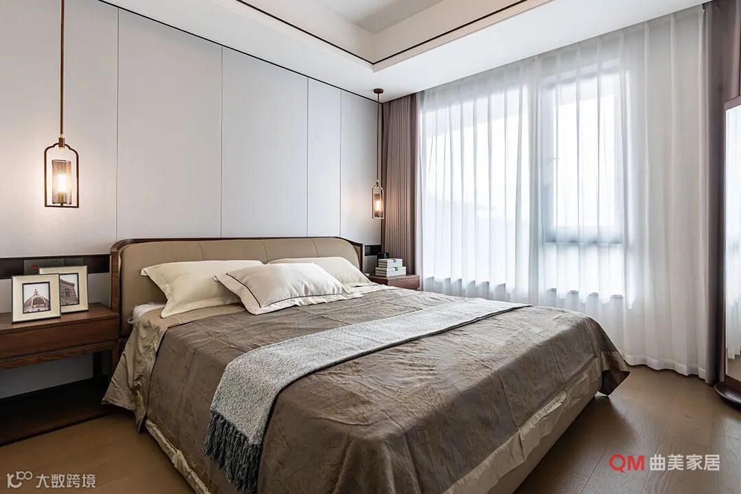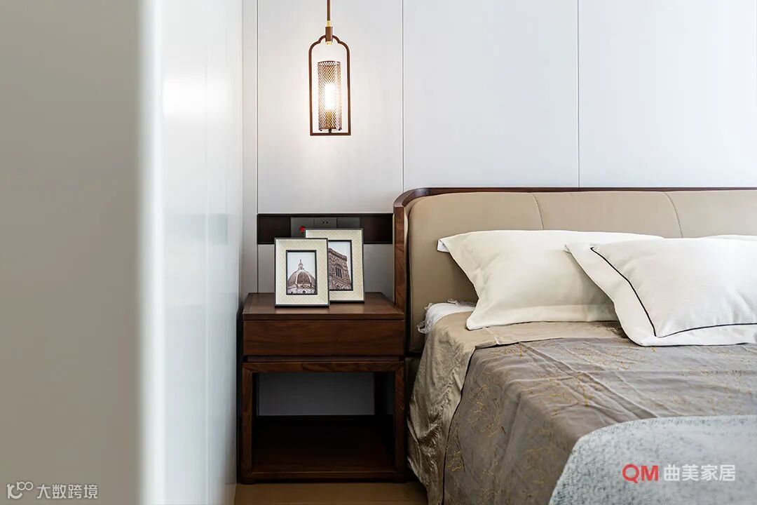 床头两侧对称的木边柜,延续空间统一的材质语言,与悬浮式壁灯的金属灯罩遥相呼应,细节处透露出克制的精致感。