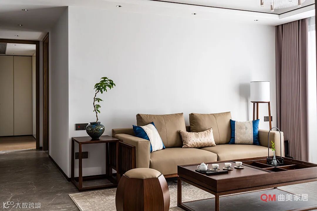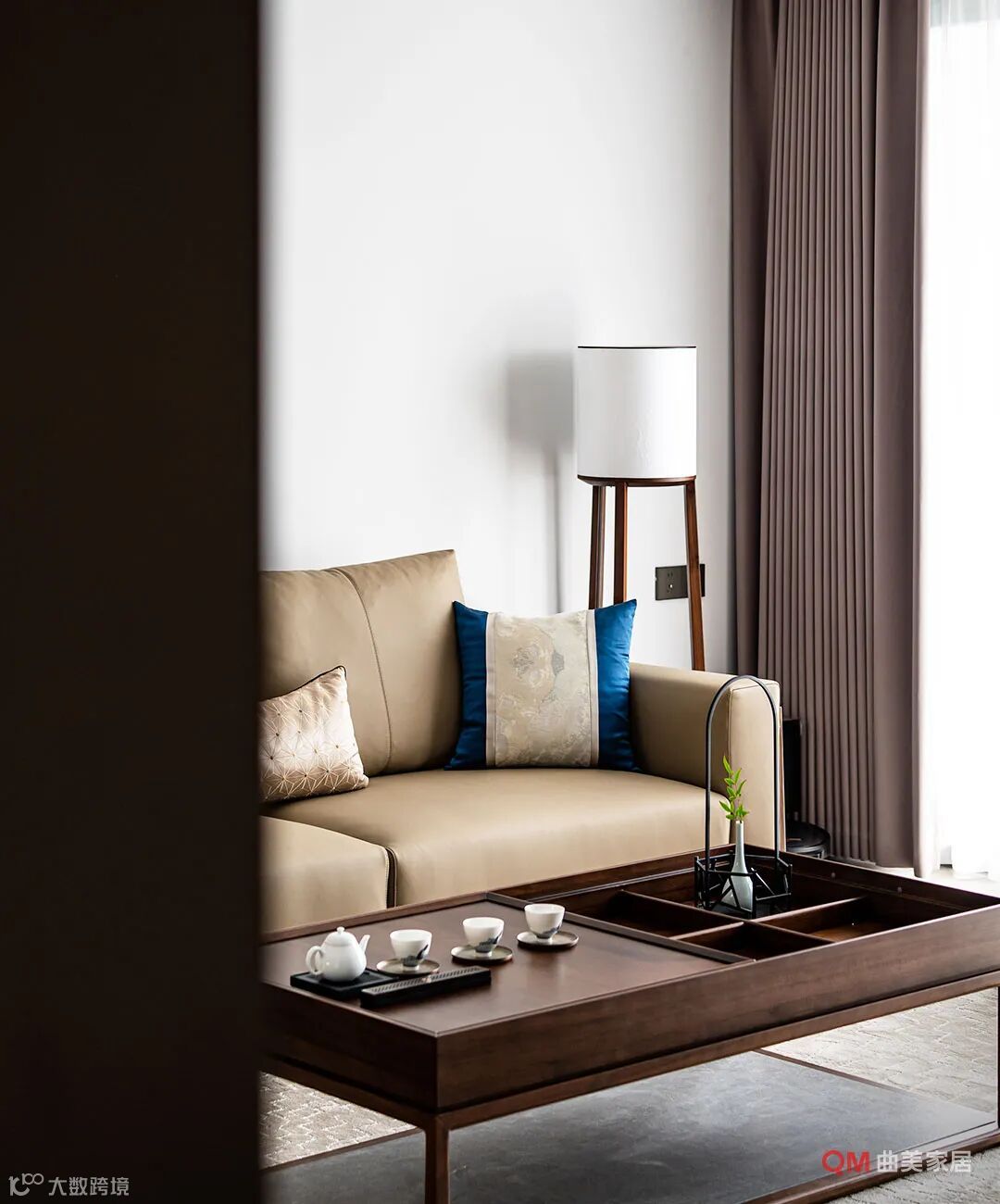 步入客厅,鸡翅木温润的深棕纹理与头层牛皮的细腻光泽交织,勾勒出中古风独有的复古雅韵。沙发选用顶级头层牛皮包裹,触感细腻柔韧,淡漠色与深木色碰撞出沉稳与轻盈的平衡之美。一侧放置极简展示架,可陈列瓷器与藏书,于实用收纳中透出文人气息。