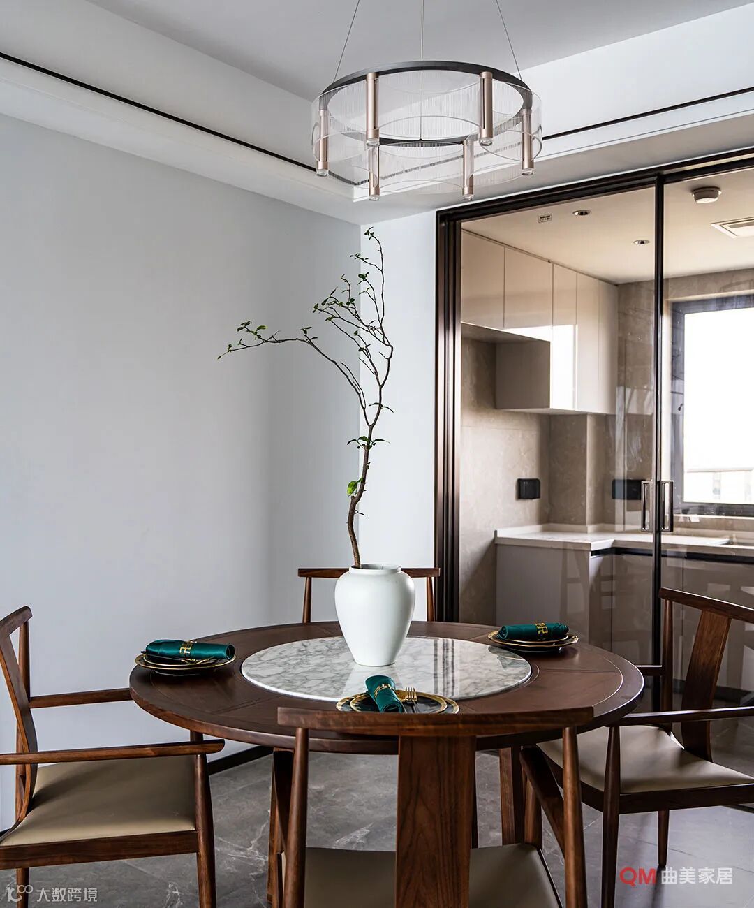 厨房与餐厅之间以黑框玻璃推拉门隔断,极窄边框设计弱化视觉阻隔,透光玻璃将厨房的烟火气温柔引入餐厅,同时巧妙规避油烟的侵扰。
