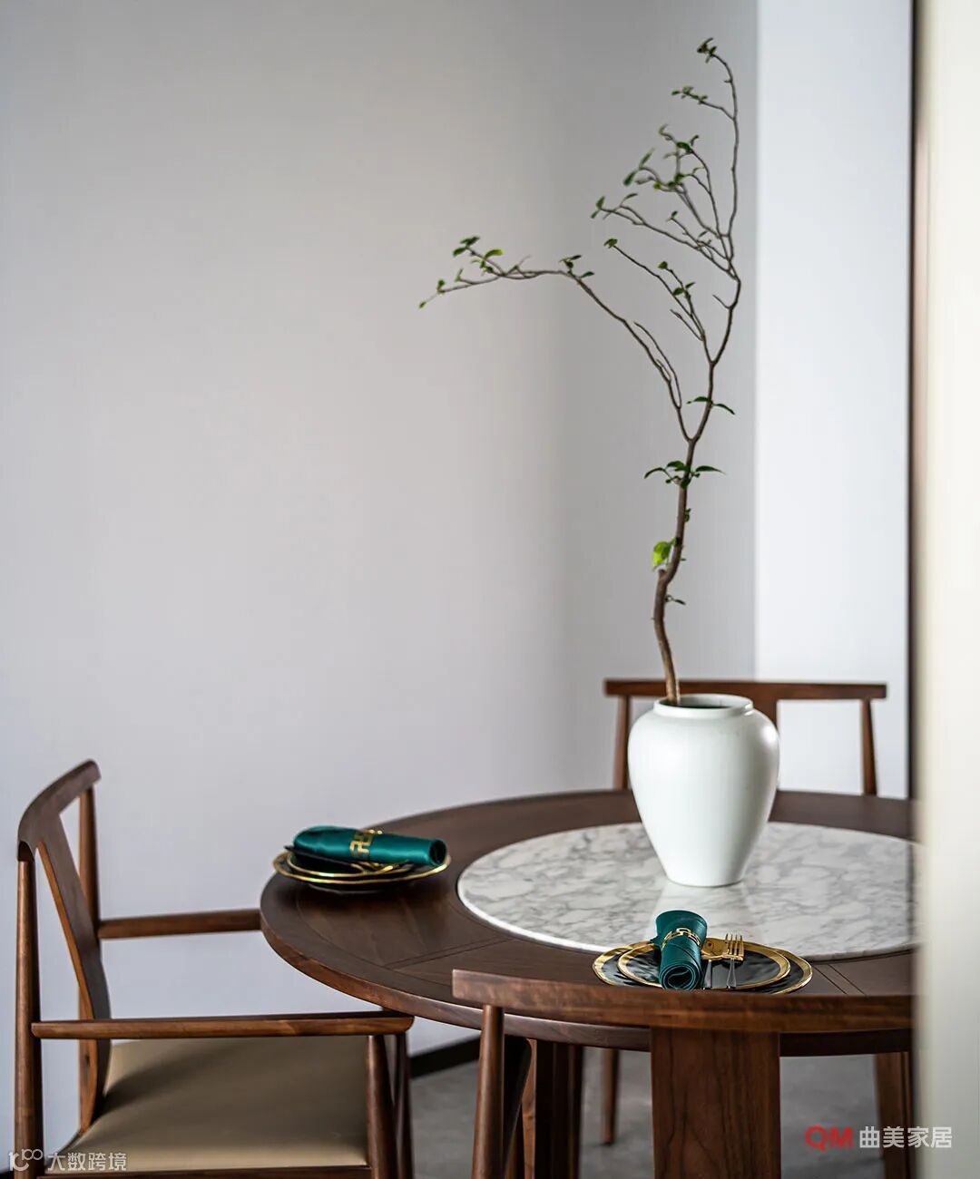 餐厅以开放式布局与客厅自然衔接,通透的空间感让光影与生活在此自由流淌。餐桌采用浑厚的木质纹理如年轮般铺陈,搭配同系列餐椅,坐垫以头层牛皮包裹,柔韧的触感与木质硬朗的线条形成巧妙平衡,既呼应复古基调,又赋予用餐时光从容的仪式感。
