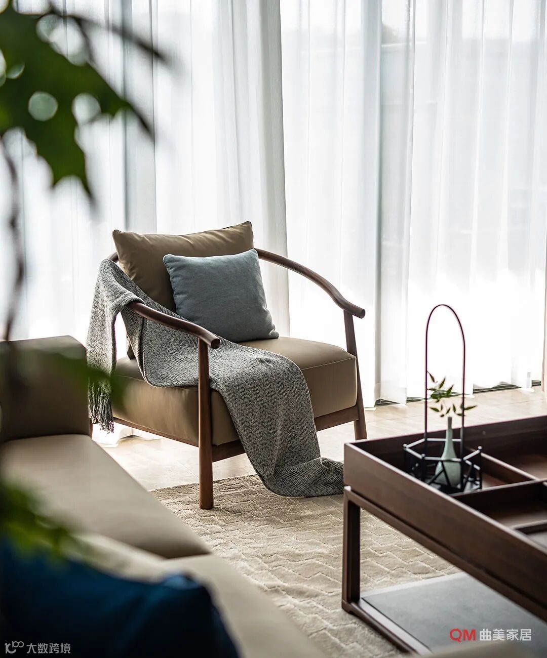 整体风格属于中古风,以"奢而不华"为理念,让木香、皮料与光影共奏生活诗篇,通过木与岩板的材质对话构筑空间美学。