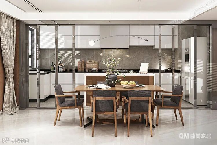 开放式布局方式让厨房和餐厅融为一体,可以随时互动、也可以各自安静,胡桃木家具搭配L型白色橱柜,颜色对比明显,视觉氛围轻松写意。