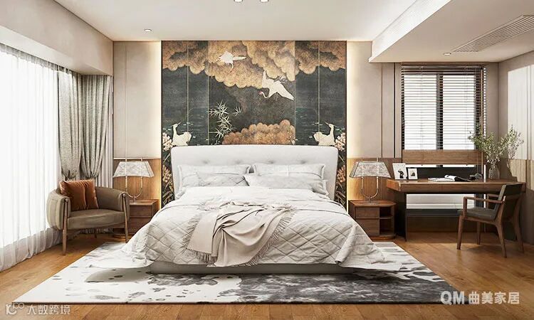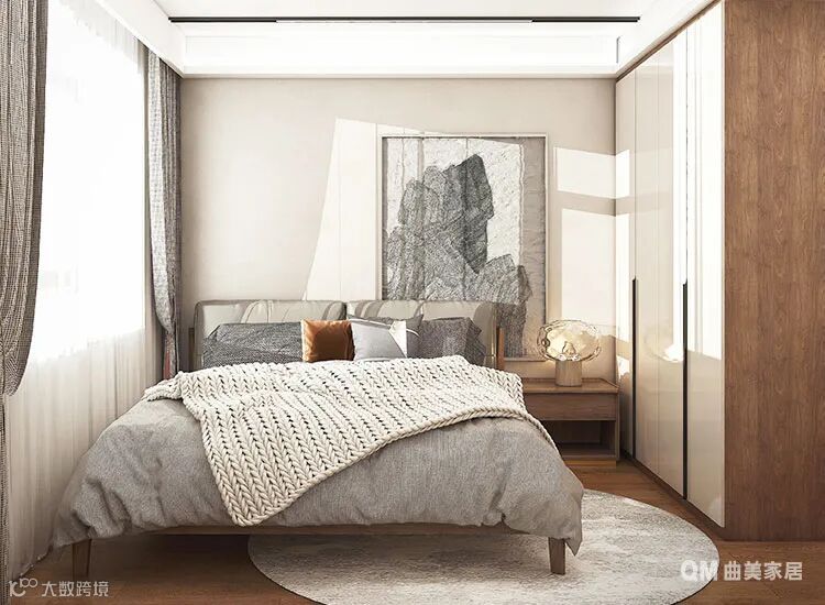 最夺人眼球的是床头的装饰背景墙画,冲淡了白色与胡桃木色的淡雅,营造出一幅厚重的低调特质,让主人可以最具自我认知的环境中淡然自处,或休憩、或工作、或学习,清清静静,怡然自得。
