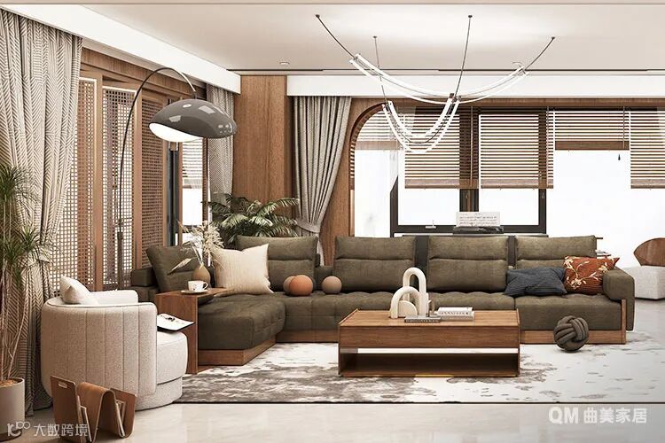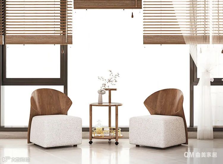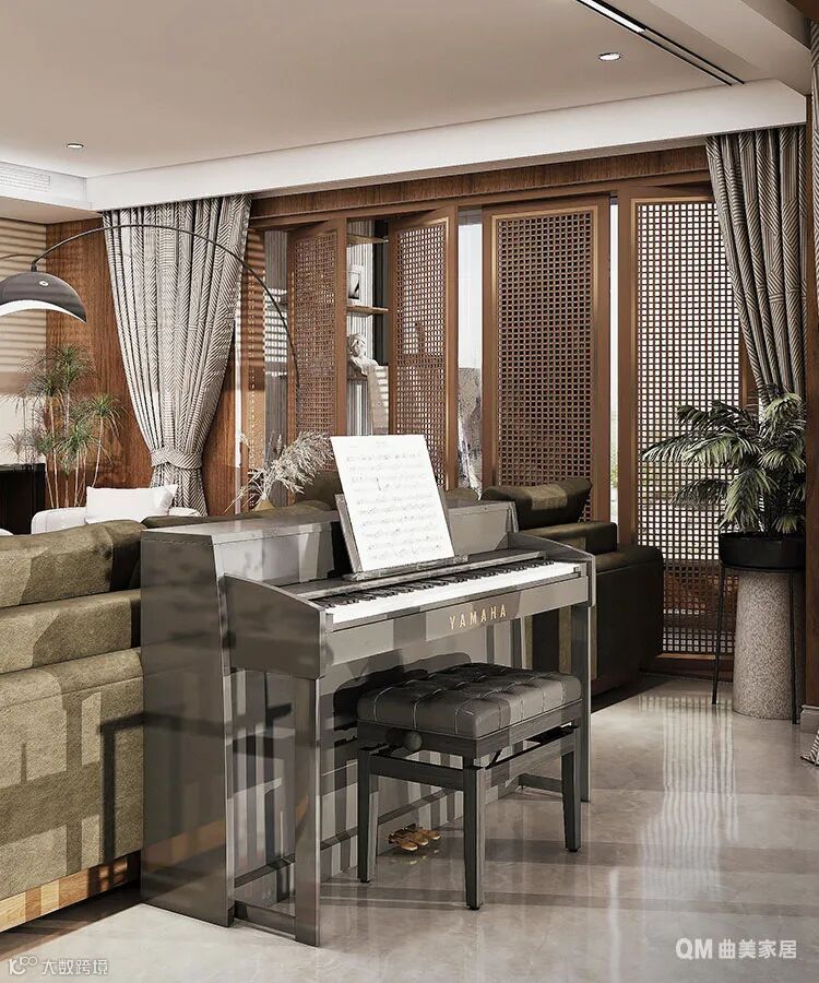 客厅整体的风格因为大量胡桃木色的应用,而显得与众不同——在于轻奢中的淳朴、在于沉稳中的俏皮。同时,金属、玻璃、藤制、布艺、粗麻多种元素的糅杂,反而让空间的整体感更为舒展,多一分少一分都不行。另外,镂空的屏风也增加了空间的互动,让本不宽敞的阳台在若隐若现中宛若另一片天地。