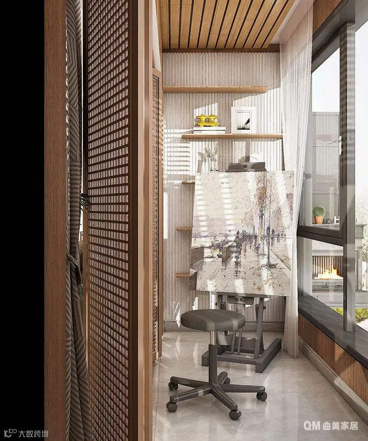 L型的阳台是家里的休闲娱乐健身空间,可以选择弹一首缓缓流淌的《天鹅》,可以画一幅无边落木萧萧下,可以坐下来喝一杯清茶,可以通过运动让身心通透。对了,阳台还是家里收纳及衣物清洗晾晒的重要区域。