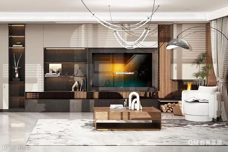 多功能电视组合柜以白色和深色为主,既满足了收纳需求,也搭配灯带效果营造了空间的通透感。