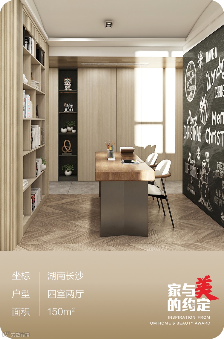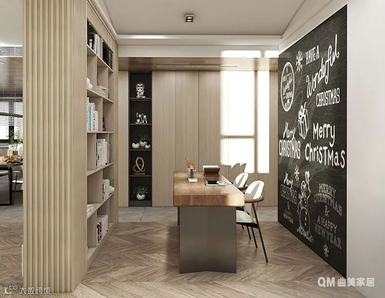 位于客厅一侧的书房,以开放式格局、简约设计为吸睛亮点。书柜依然延续了木质格栅的设计风格,书桌简约、办公椅则和餐椅系出同源,背景墙别出心裁的以板报形式突出涂鸦及互动功能。