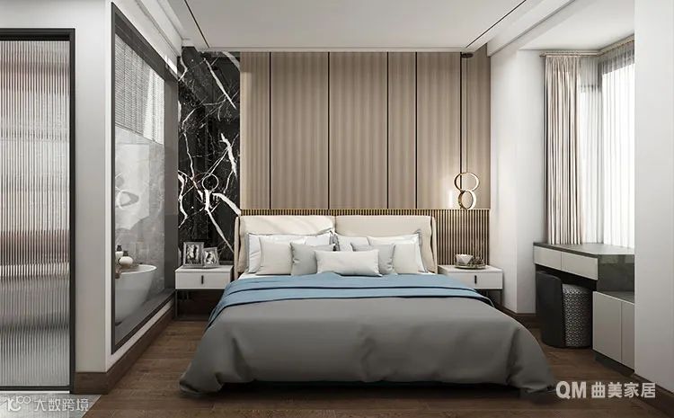 主卧运用咖色系木纹饰面+奶白色木饰面,营造了舒缓淡雅的卧室空间;飘窗抬高一半做书桌,可以满足简单的阅读或工作需求;卫生间以大面积的玻璃元素,让视觉更通透。