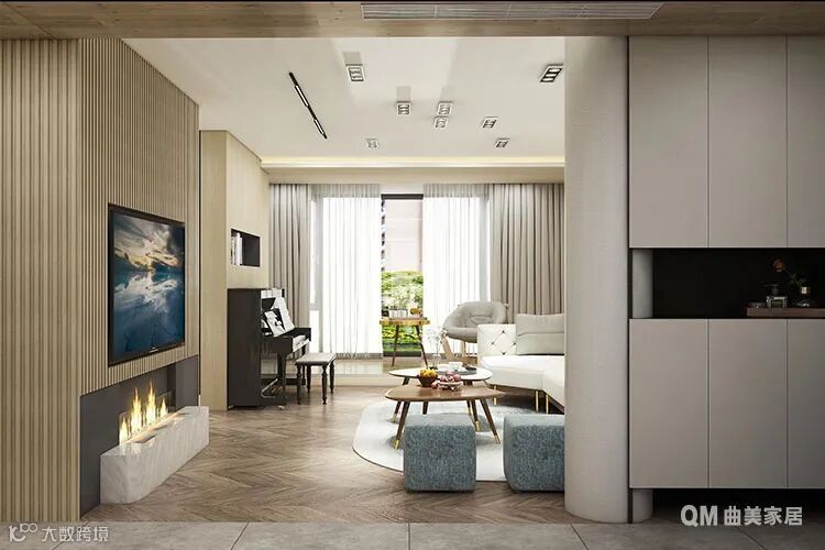 鉴于整体户型布局周正、通透,各个功能区域分布较为合理,所以设计师仅对玄关、厨房以及书房做出一定的功能设计;另外确立了现代简约的设计风格,大量运用米白色、木色、木质格栅、岩板、玻璃及金属元素,再通过克制柔和的设计语言,让空间环境更为舒适、宁静。