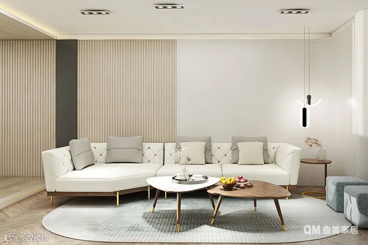 米白色和木色是客厅的原色,也让目之所及尽是典雅宁静的视觉享受——米白色和木质格栅泾渭分明的护墙、米白色的沙发、白色的茶几、透着淡淡浅灰及蓝色的地毯,构成了客厅简约但又绝对“雅”的格调,而这种格调也引领了全屋的风格。