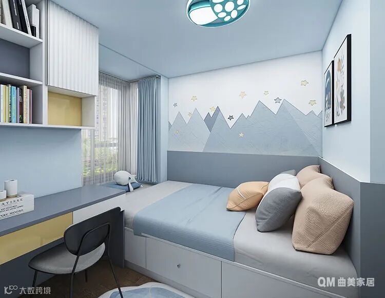 整体以蓝色布局,加上香榭白与明黄色的点缀,让空间极富活力和童趣,一字型书桌书柜的结合,让小男生在自由的空间氛围中快乐成长。