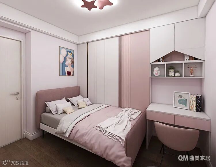 区别于男孩房的蓝色元素,女孩房整体以粉色布局,同时也加入了香榭白与格栅元素,十分符合小女生对于卧室环境的需求。