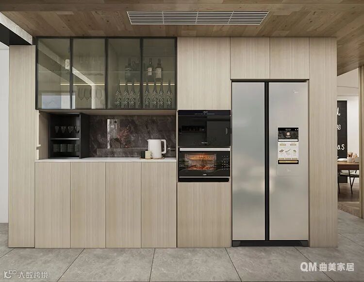 作为厨房与餐厅空间的延展,餐边柜有效分担了一部分厨房及餐厅的收纳压力,同时,优化了餐厨动线,取用物品更加便捷;搭配玻璃柜门,餐边柜也具备了展示户主丰富藏酒的功能。